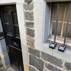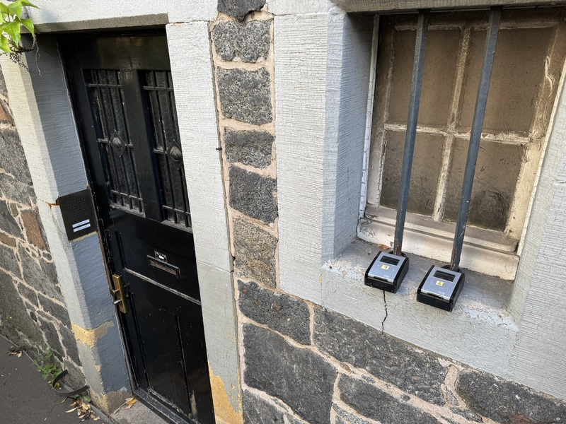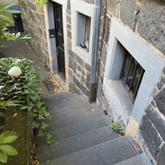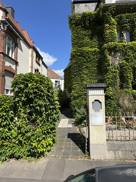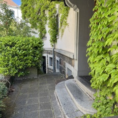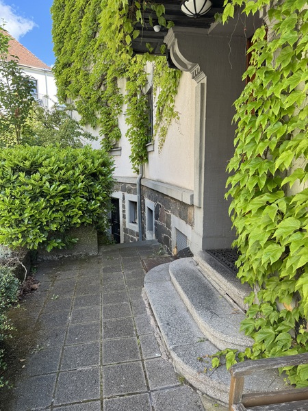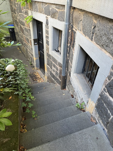 Vorbei am Haupteingang des Hauses ein paar Stufen runter zum Nebeneingang, einer schwarzen Holztür.